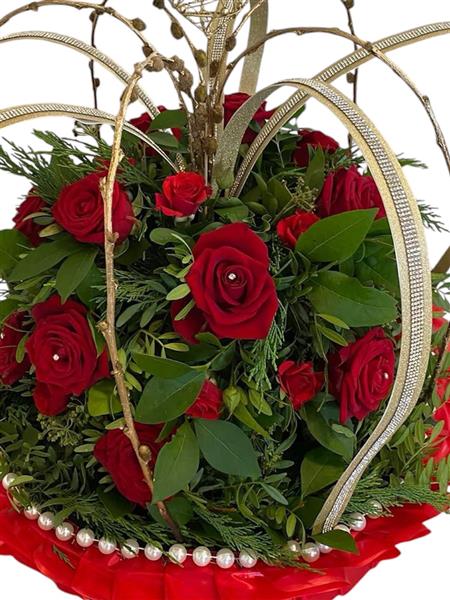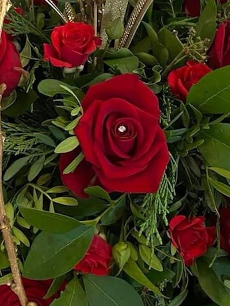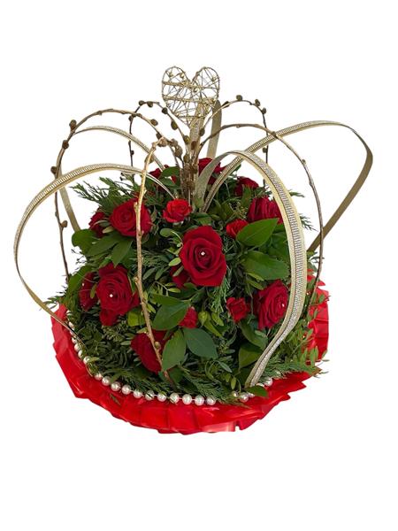 A crown fit for a Queen! This amazing 3D piece sits upon an 18” base, filled with velvet red roses, and mixture of foliage. Pearls, gold and diamanté features to add the finishing touches.