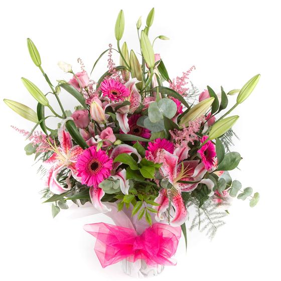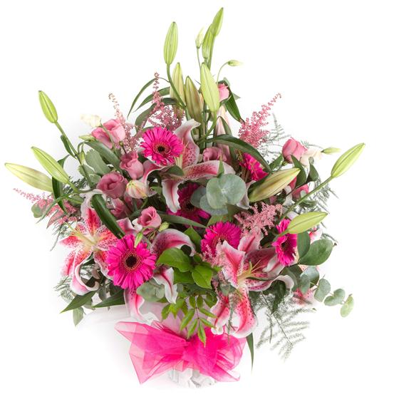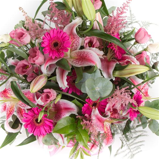 A fun and fabulous display of vibrant pinks including scented oriental lilies and mini gerberas.