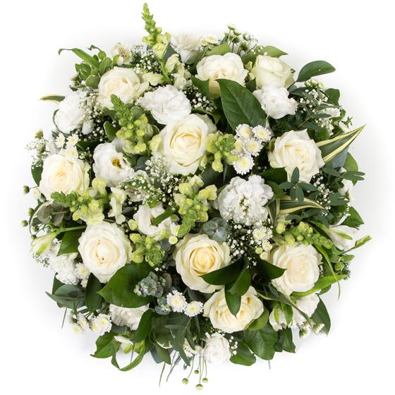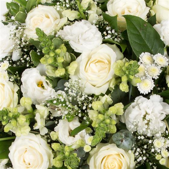 A collection of white and cream flowers with roses, million star and variegated greenery combine to create a simple and beautiful tribute. Pictured is the 16" arrangement