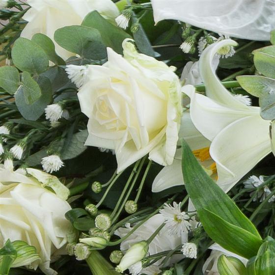 A simple combination of cream and white blooms and unusual greens. Anthuriums, lilies and roses are included in this modern style sheaf.