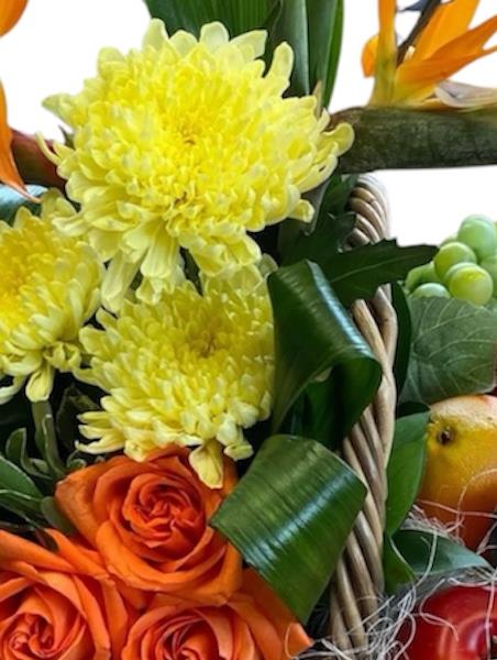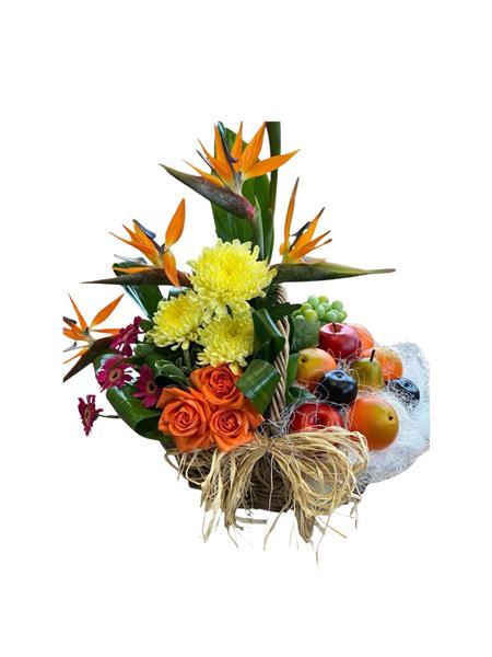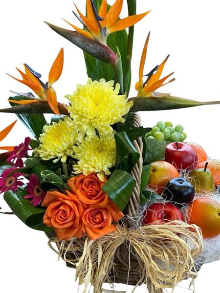 Half the basket contains artificial fruit pieces and the other half a vibrant arrangement of flowers