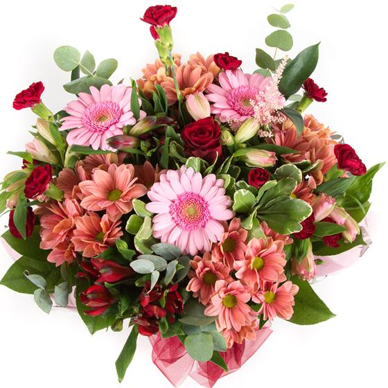 A hand-tied bouquet in a variety of deep red and pink shades encasing a single, long stemmed red rose.