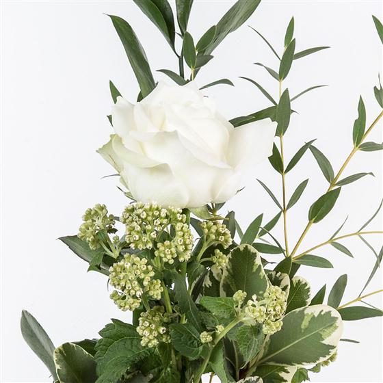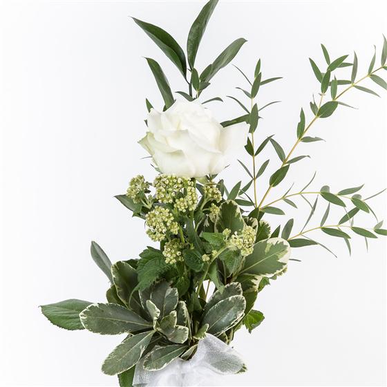 A single long stemmed white rose presented in a vase with mixed foliage sends a simple message.