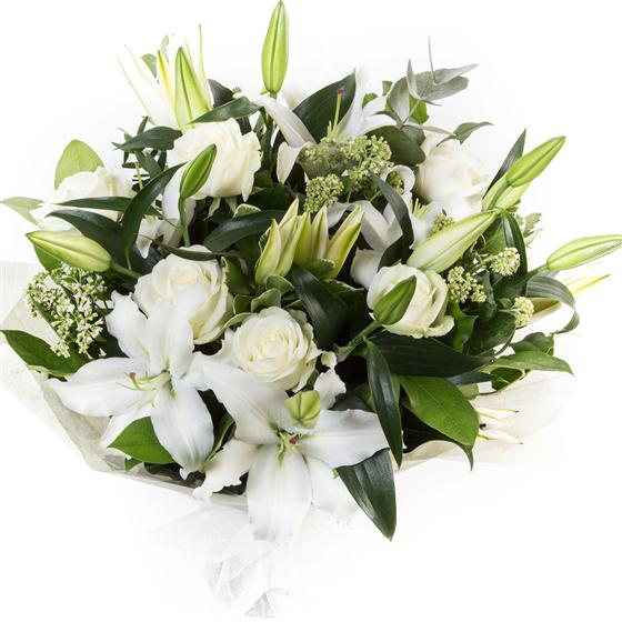 A fragrant hand-tied bouquet of oriental lilies and white roses mixed with eucalyptus.
